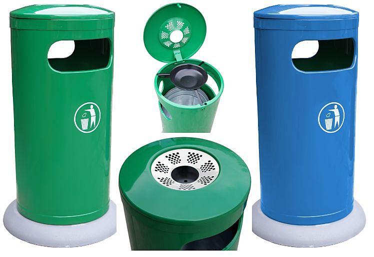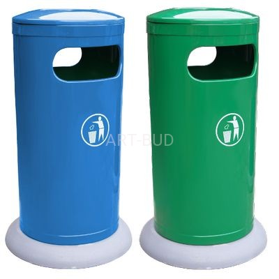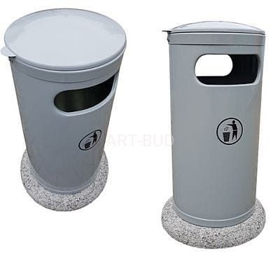Wolnostojący kolumnowy kosz na śmieci z blachy ocynkowanej o pojemności 50 litrów. Kosz bardzo stabilny z podstawą betonową z grysu płukanego. Wewnętrzne wiadro ocynkowane, wyjmowane przez zdjęcie kopuły w której znajduje się popielniczka. Dwa otwory wrzutowe podłużne umieszczone bocznie poniżej kopuły. Kosz niezwykle stabilny dzięki betonowej podstawie, może być stosowany zarówno wewnątrz jak i na zewnątrz budynków.
