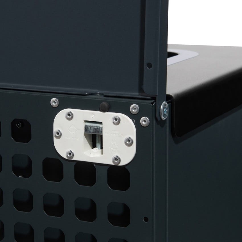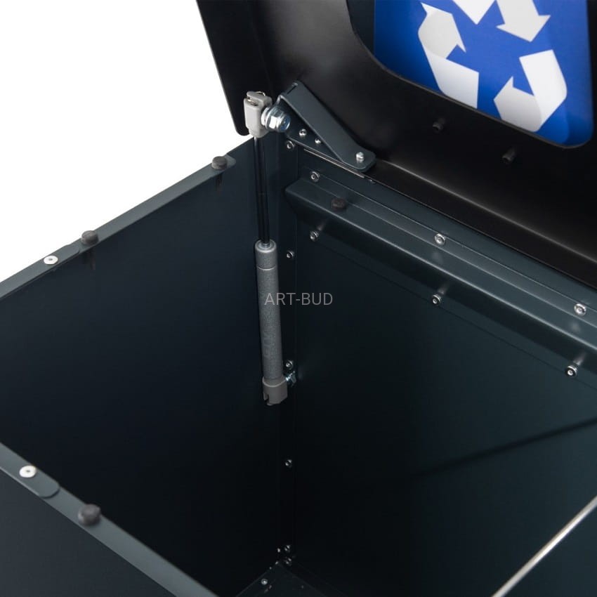 Solidna konstrukcja ze stali ocynkowanej, malowanej proszkowo w kolorze antracytowym, zapewnia estetykę i odporność na czynniki zewnętrzne. Pokrywa w kolorze czarnym zawiera cztery otwory wrzutowe oznaczone kolorowymi obwódkami zgodnie z wytycznymi Ministerstwa Środowiska, co ułatwia prawidłową segregację.