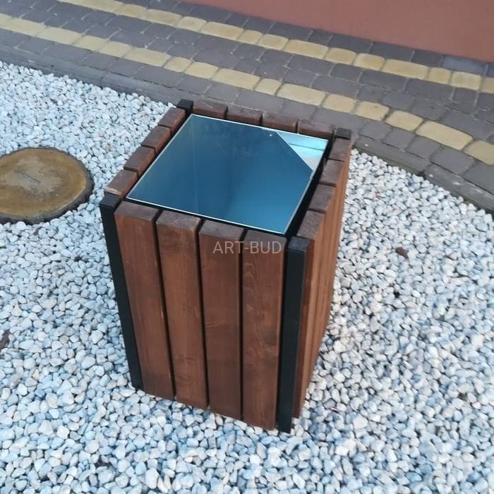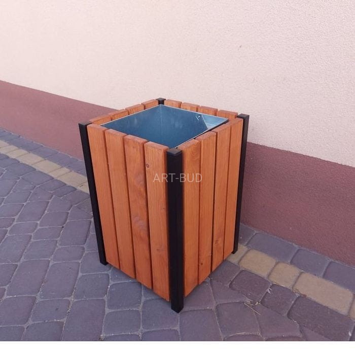Kosz na śmieci drewniany na konstrukcji stalowej z wkładem wyjmowanym z blachy ocynkowanej.