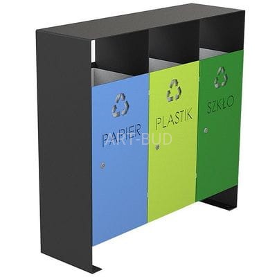 Efektowny zadaszony, nowoczesny kosz trzykomorowy do podstawowej segregacji odpadów o konstrukcji z blachy stalowej. Kosz posiada kontrastowe fronty metalowe z napisami o rodzaju odpadów, oraz otwory wrzutowe poziome w przedniej ścianie pojemników. Konstrukcja metalowa jest standardowo malowana na kolor czarny. Na życzenie w opcjach dodatkowych, możliwość malowania na kolor z palety RAL.