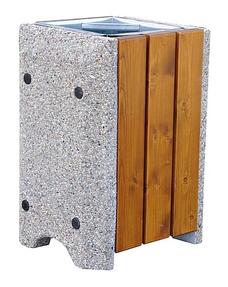Betonowy kosz miejski z elementami drewnianymi. Klasyczne uzupełnienie przestrzeni zurbanizowanych, ulic , placów , pasaży. Niezbędny element traktów pieszych i dopełnienie ławek, stołów itp. Kosz betonowy wykonany jest z betonu wysokiej klasy, wibrowanego, zbrojonego stalą, wykonany w technologii "beton płukany" pokryty kamieniem płukanym lub mieszanką grysów.