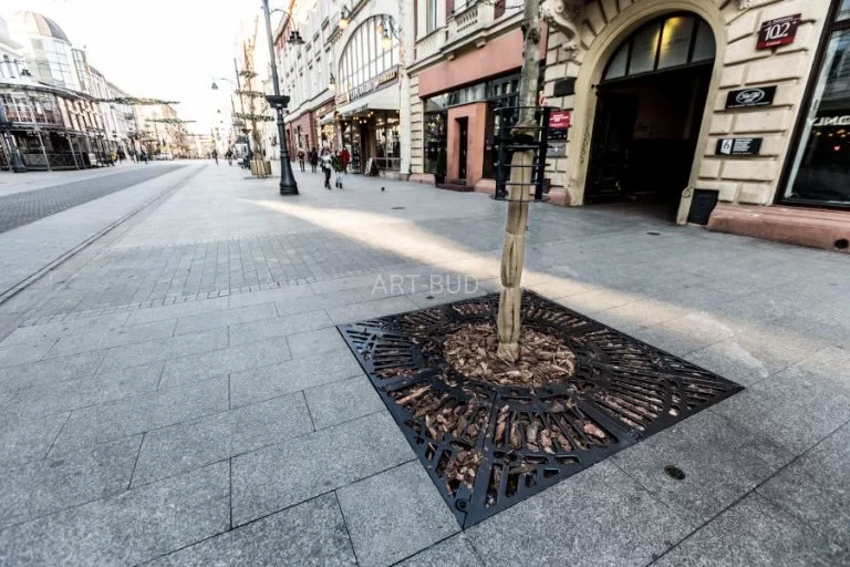 Poza oczywistymi walorami estetycznymi nasza krata pod drzewo pełni kilka funkcji. Chroni system korzeniowy przed zniszczeniem, a zarazem pozwala na dopływ wód opadowych do tego systemu. Dzięki temu otrzymujemy nie tylko zabezpieczenie okolicy drzewa przy np. chodniku, ale również wspieramy jego rozwój.