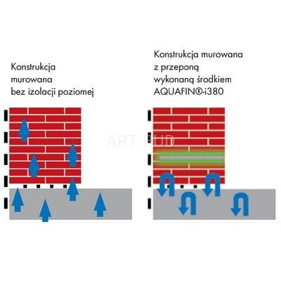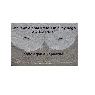 Ściany z nieistniejącą lub ewentualnie uszkodzoną izolacją poziomą mają tendencję do kapilarnego podciągania wilgoci, zwiększonej absorpcji wody ze względu na strukturę naczyń włosowatych. Następuje destrukcja samego muru, a w przypadku braku podjęcia działań zaradczych pojawienie się grzybów i pleśni, co dodatkowo pogarsza mikroklimat wewnątrz pomieszczeń. Skuteczność produktów AQUAFIN od 50 lat została udowodniona podczas budowy lub renowacji różnych obiektów budowlanych. AQUAFIN-i380 to gwarantowane rozwiązanie odtwarzania prze-pon poziomych. Nowy krem iniekcyjny na bazie silanów nie wymaga stosowania ciśnienia podczas aplikacji. Materiał poprawia właściwości hydrofobowe podłoża, co pozwala uniknąć przygruntowego zawilgocenia ściany (podciągania). AQUAFIN-i380 jest w pełni skuteczny nawet przy stopniu nasycenia wilgocią do 95% zgodnie z instrukcją WTA 4/4/04 (Zabezpieczenie konstrukcji murowanych przed podciąganiem kapilarnym przez iniekcję). Ze względu na specjalny skład- rozmiar cząstek składnika aktywnego jest znacznie mniejszy, niż w standardowych produktach. Środek nie reaguje z wodą, natomiast reaguje wyłącznie z podłożem. Charakter hydrofilowy składnika aktywnego oznacza szybsze rozpraszanie w wodzie kapilarnej i zapewnia automatyczną iniekcję oraz 100% nasycenie porów. Po reakcji z podłożem, ścianki kapilary stają się hydrofobowe, a podciąganie wody lub wilgoci spowodowane ciśnie-niem osmotycznym (absorpcja wody w kapilarach) jest ograniczone, zapewniając suszenie podłoża. Zaletą środka AQUAFIN-i380 jest jego kremowa konsystencja, która zapobiega wypływaniu produktu z otworów oraz możliwość apliko-wania w niepełne struktury jak np. cegła kratówka, mur z pustkami, czy z niepełną spoiną. Dotychczas wymagało to dodatkowych nakładów robocizny oraz materiałów wypełniających.