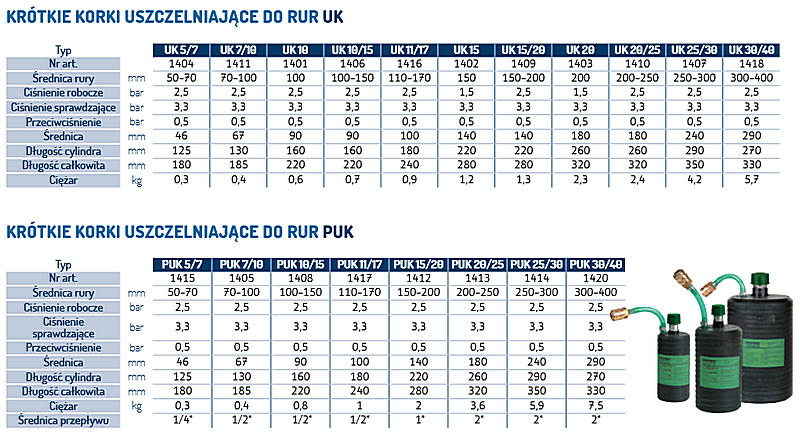 Krótkie korki uszczelniające do rur i kanalizacji zamykane pneumatyczne typ UK i PUK