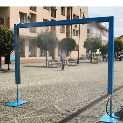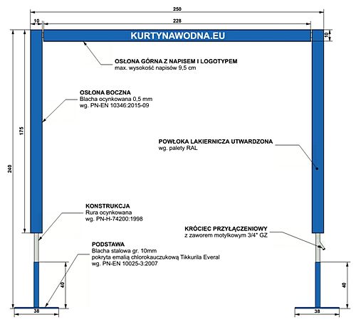 Konstrukcja bramki zraszającej jest w całości wykonana ze stali nierdzewnej. Podstawy malowane na kolor RAL7010. Podana cena i czas realizacji obejmuje wykonanie osłon bramki. Dwie podstawy o wymiarach 20 cm x 78 cm ważą 20 kg każda, co sprawia że kurtyna stoi solidnie i bezpiecznie bez konieczności dociążania lub kotwienia.