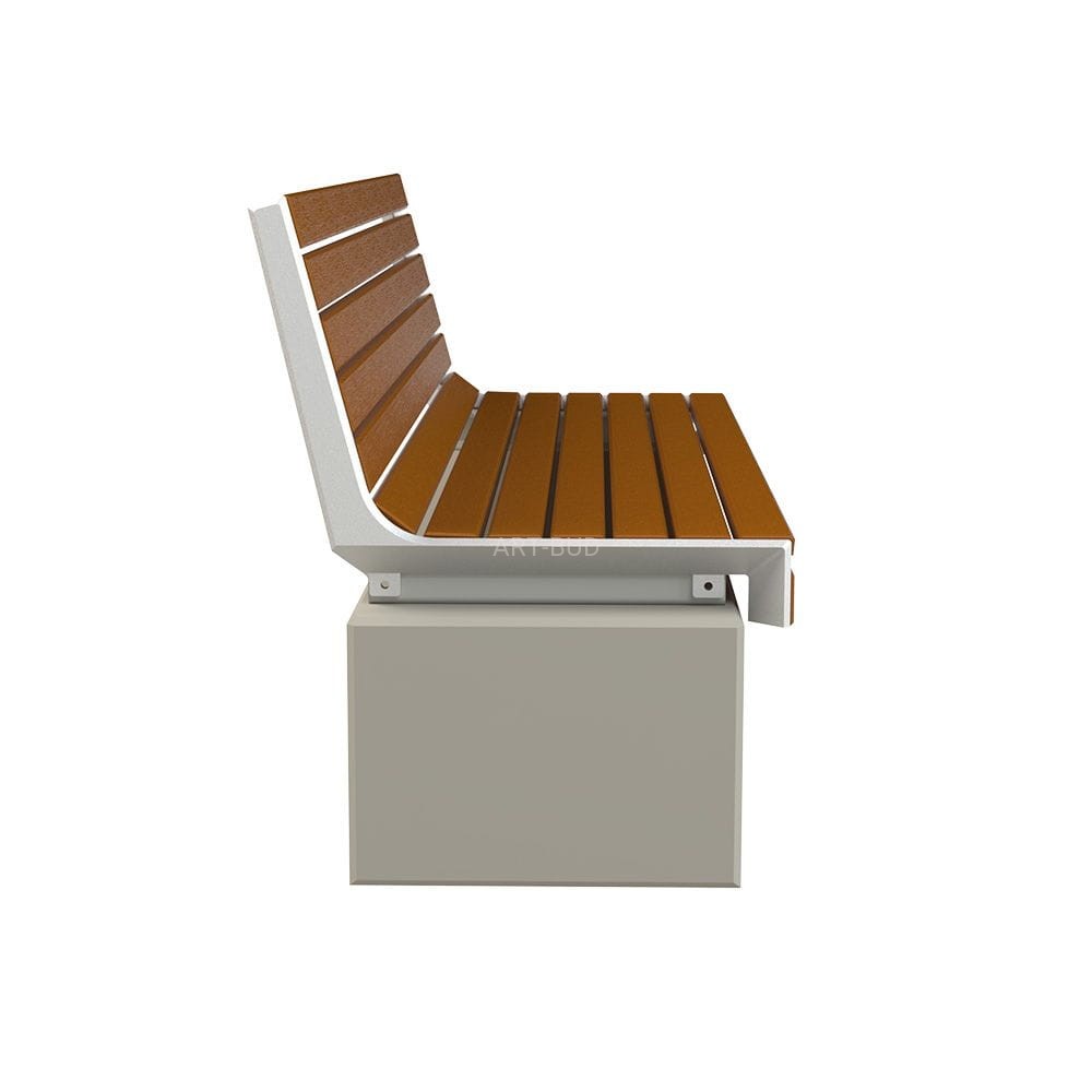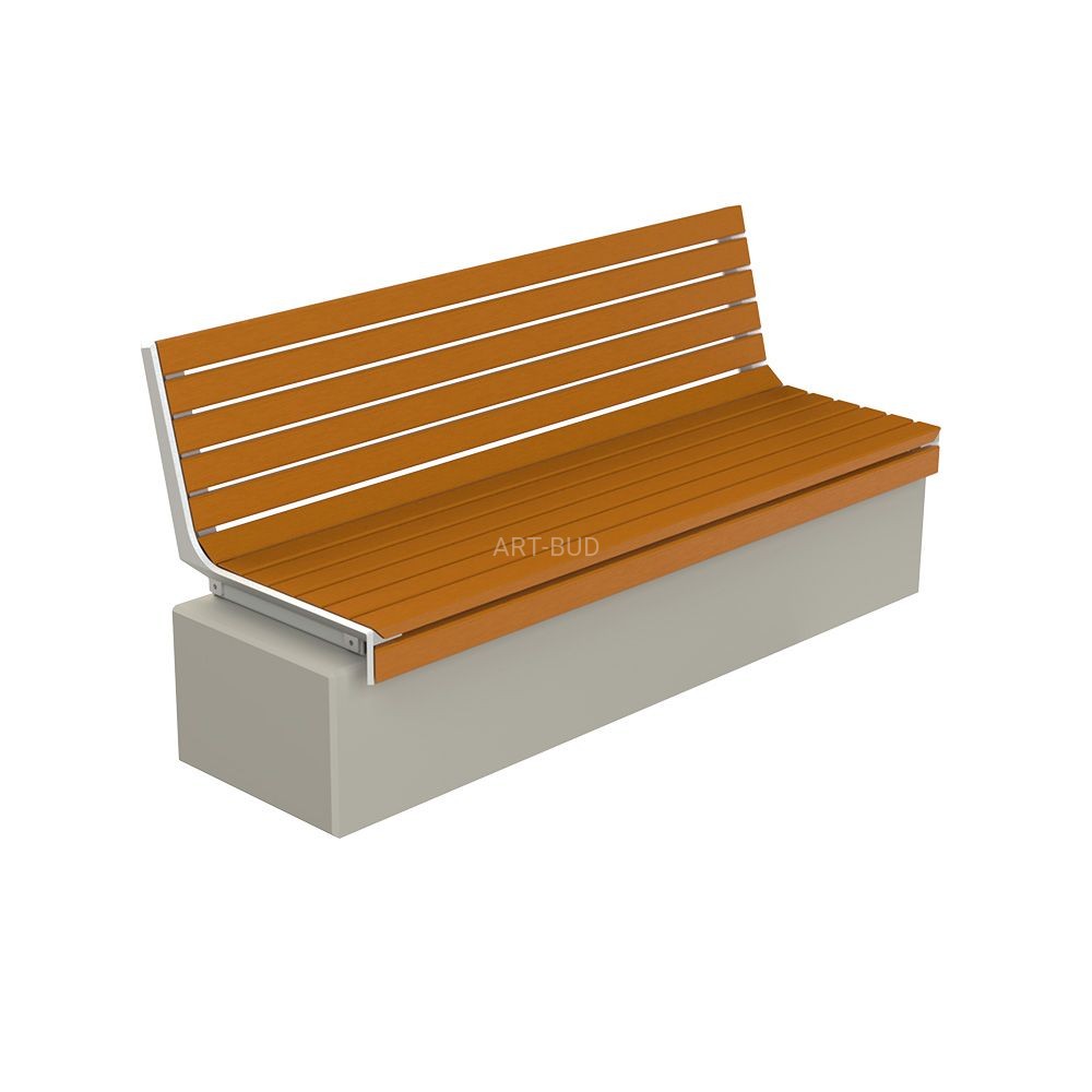 Nowoczesna ławka miejska z betonu architektonicznego z siedziskiem drewnianym i oparciem. Jest to duża ciężka ławka wolnostojąca, która nie wymaga dodatkowego mocowania do podłoża. Nowoczesna forma pozwala na wszechstronne zastosowanie, przeznaczona przede wszystkim do zastosowania na pasażach miejskich, parkach, terenach rekreacyjnych, basenach plenerowych, plażach i uzdrowiskach.