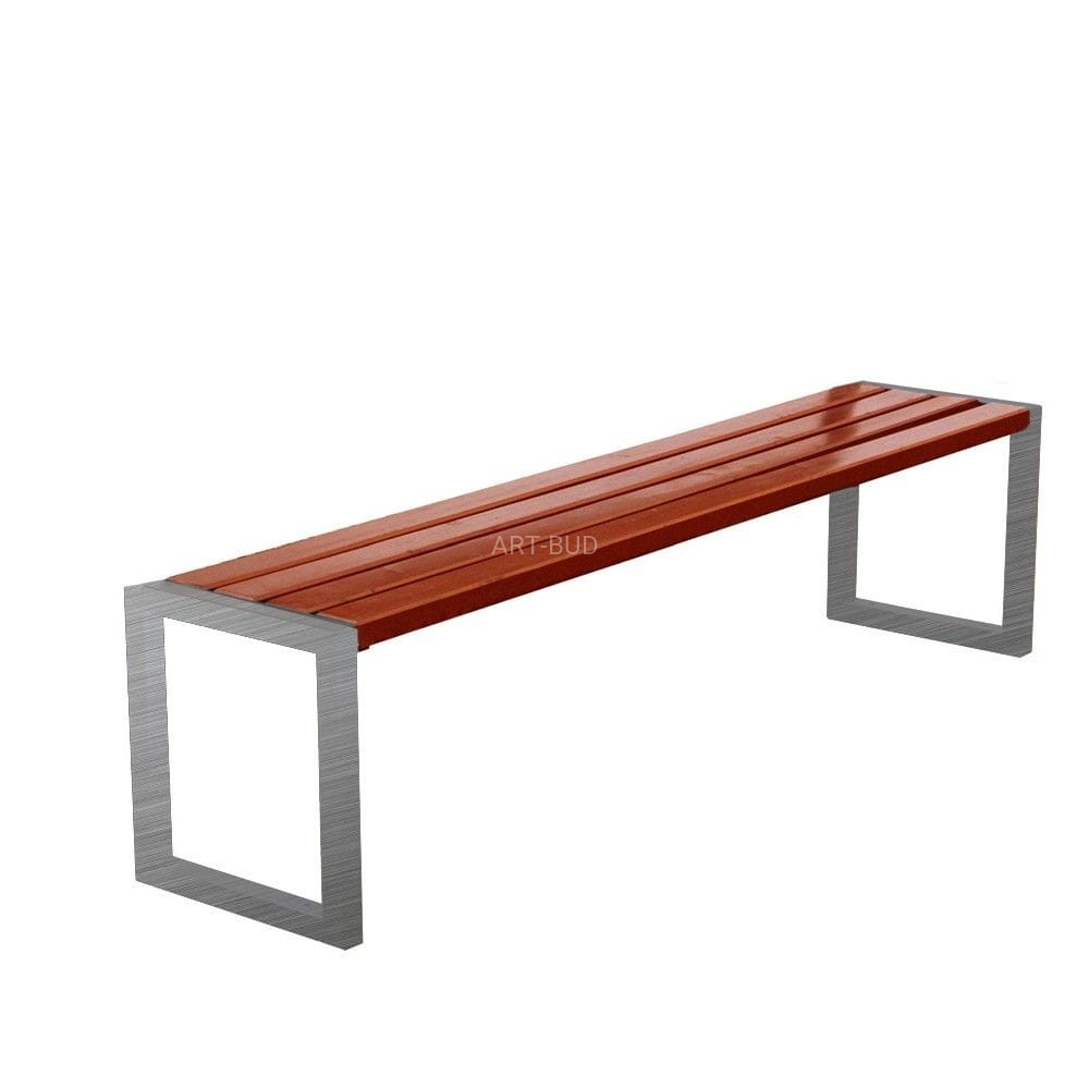 Klasyczna, uniwersalna ławka drewniano stalowa bez oparcia. Konstrukcja ławki ze stali nierdzewnej inox podnosi jej estetykę, trwałość i nowoczesny design. Ławki tego typu, ze względu na wysoką estetykę i trwałość, często znajdują zastosowanie również w obiektach i pomieszczeniach zadaszonych, dworcach, poczekalniach, pasażach i galeriach.