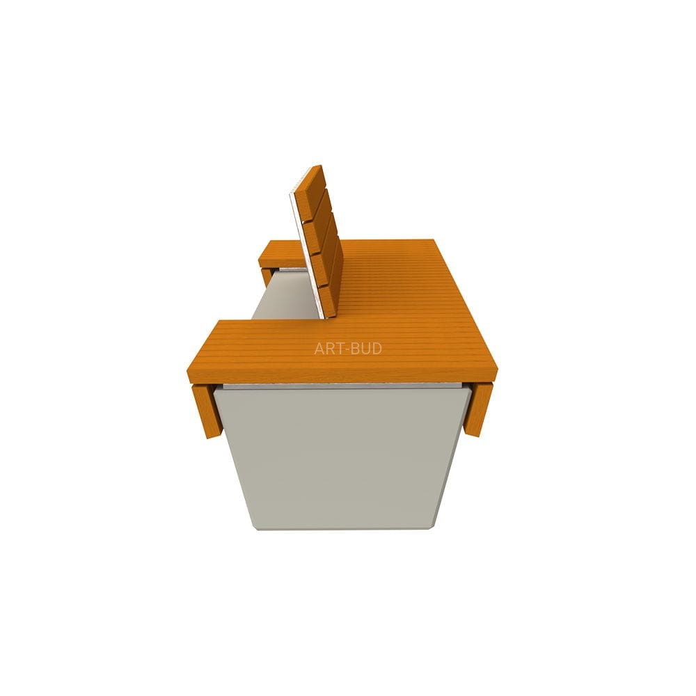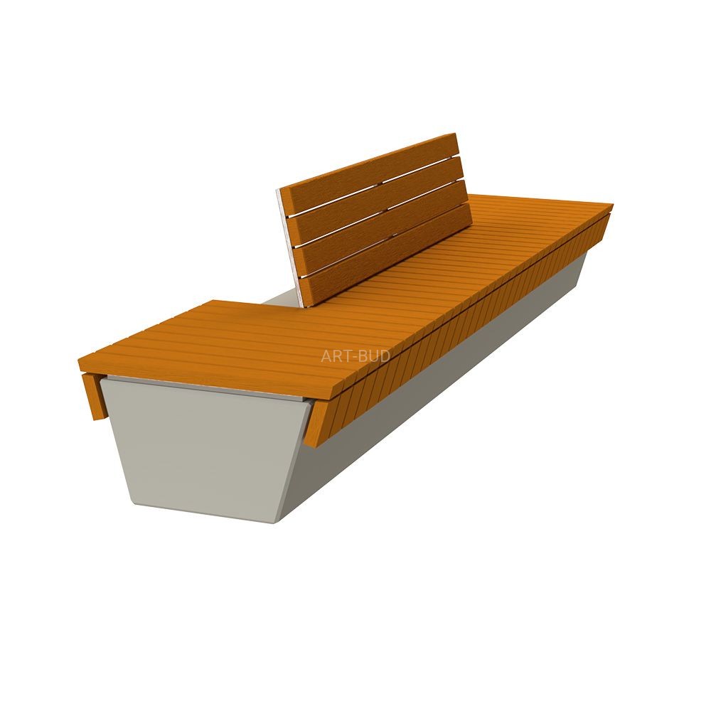 Nowoczesna ławka miejska z betonu architektonicznego z siedziskiem i oparciem drewnianym. Jest to duża ciężka ławka wolnostojąca, która nie wymaga dodatkowego mocowania do podłoża. Nowoczesna forma pozwala na wszechstronne zastosowanie, a duża szerokość siedziska umożliwia wykorzystanie przez większą liczbę osób.