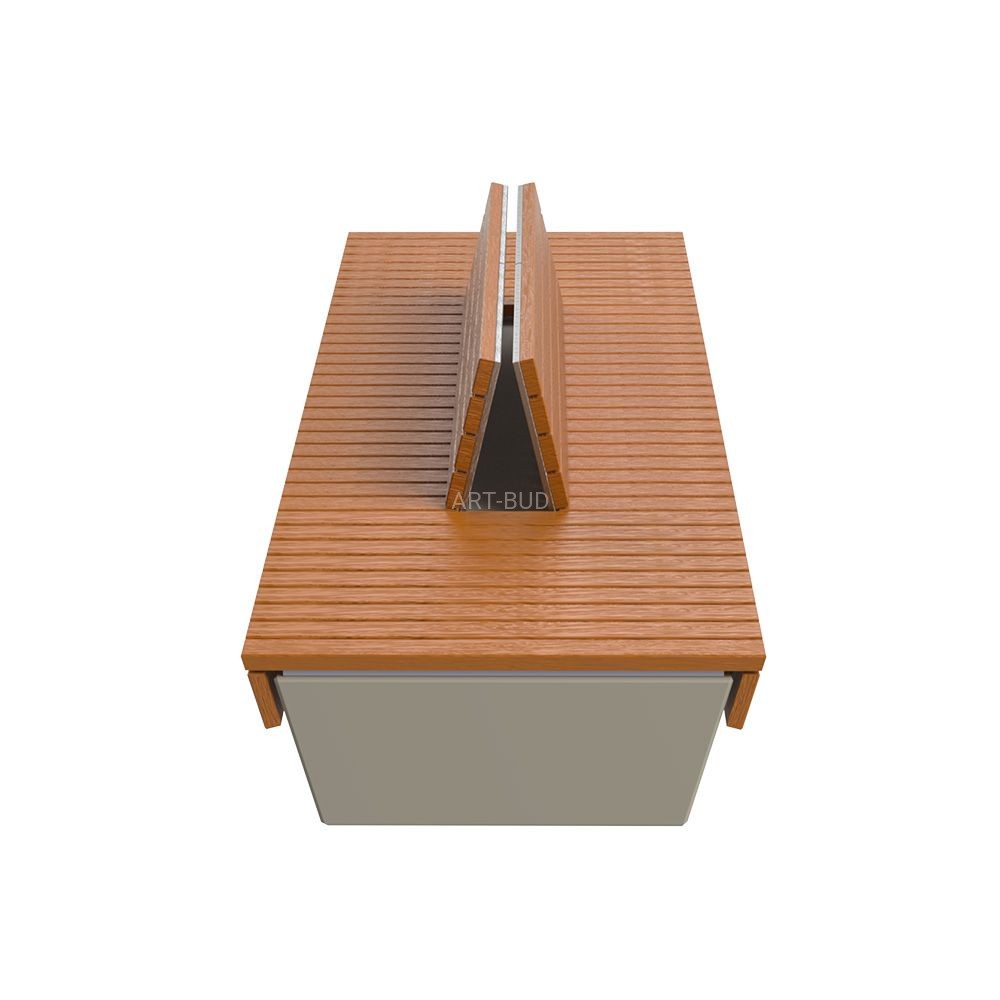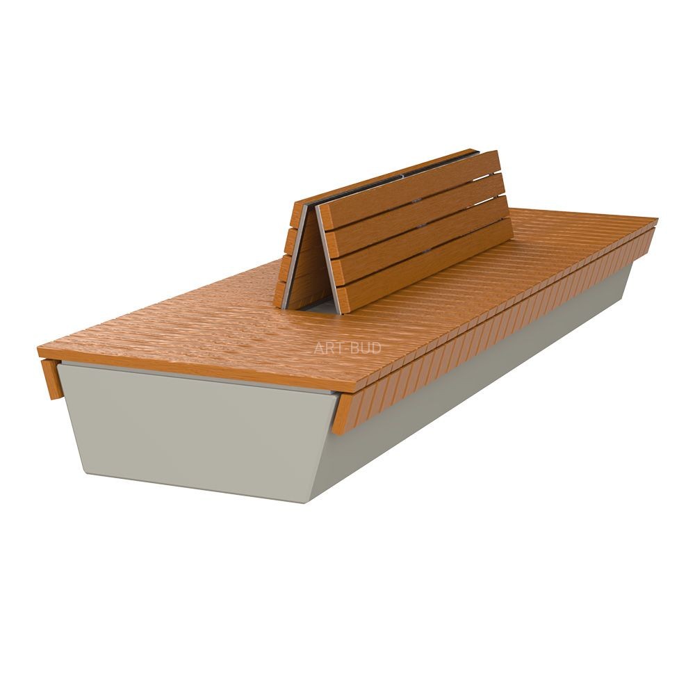 Nowoczesna ławka miejska z betonu architektonicznego z siedziskiem i oparciem drewnianym dwustronnym. Jest to duża ciężka ławka wolnostojąca, która nie wymaga dodatkowego mocowania do podłoża. Nowoczesna forma pozwala na wszechstronne zastosowanie, a duża szerokość siedziska umożliwia wykorzystanie przez większą liczbę osób.