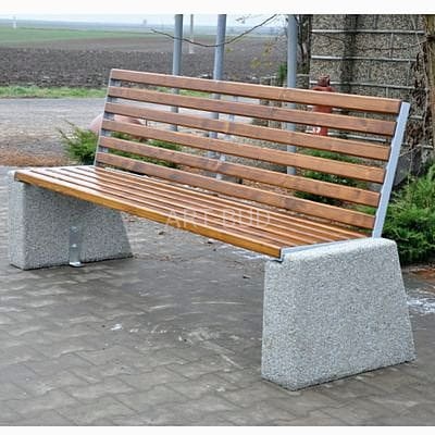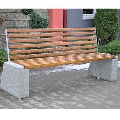Ławka parkowa trapezowa z oparciem podstawa z betonu płukanego siedzisko i oparcie drewniane