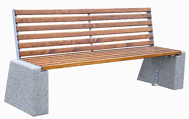 Mocna, wyjątkowo ciężka i stabilna ławka parkowa, odporna na urazy mechaniczne i przypadkowe przemieszczenie. Elementy betonowe ławki „Trapezowej z oparciem” wykonane są z betonu wysokiej klasy, zbrojonego stalą oraz mikrozbrojeniem, wykonane w technologii „beton płukany” pokryty kamieniem płukanym lub mieszanką grysów. Siedzisko i oparcie wykonane z drewna świerkowego o grubości 4 cm, malowane dwukrotnie lakierobejcą na wybrany z naszej kolorystyki listew kolor, lakierowane.
