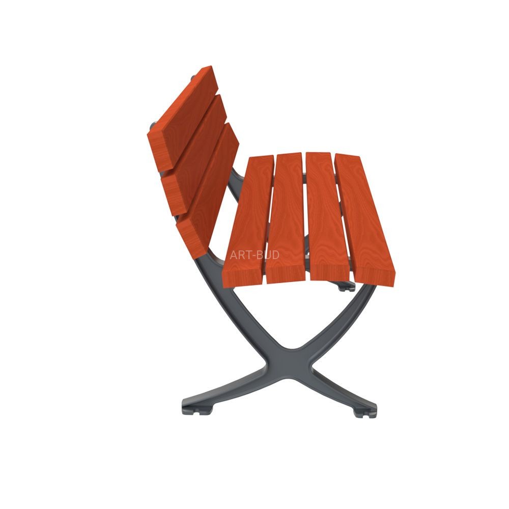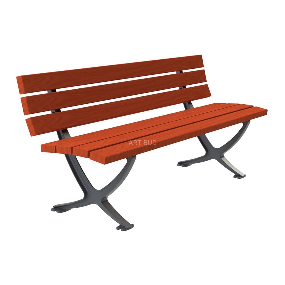 Nowoczesna ławka parkowa uliczna, drewniana, na konstrukcji żeliwnej, do samodzielnego montażu. Oferowana w trzech rodzajach drewna, długości 150 lub 180 cm. Do wyboru są również kolory lakierów i impregnatów, a także kolor farby nawierzchniowej konstrukcji żeliwnej. Ławka przygotowana do montażu przez przykręcenie w podłożu utwardzonym.