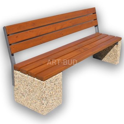 Ławka betonowa z oparciem, długość 180 cm nr kat 194 Trwała, odporna na zmienne warunki atmosferyczne i uszkodzenia mechaniczne, siedzisko wykonane z drzewa o grubości 4 cm.