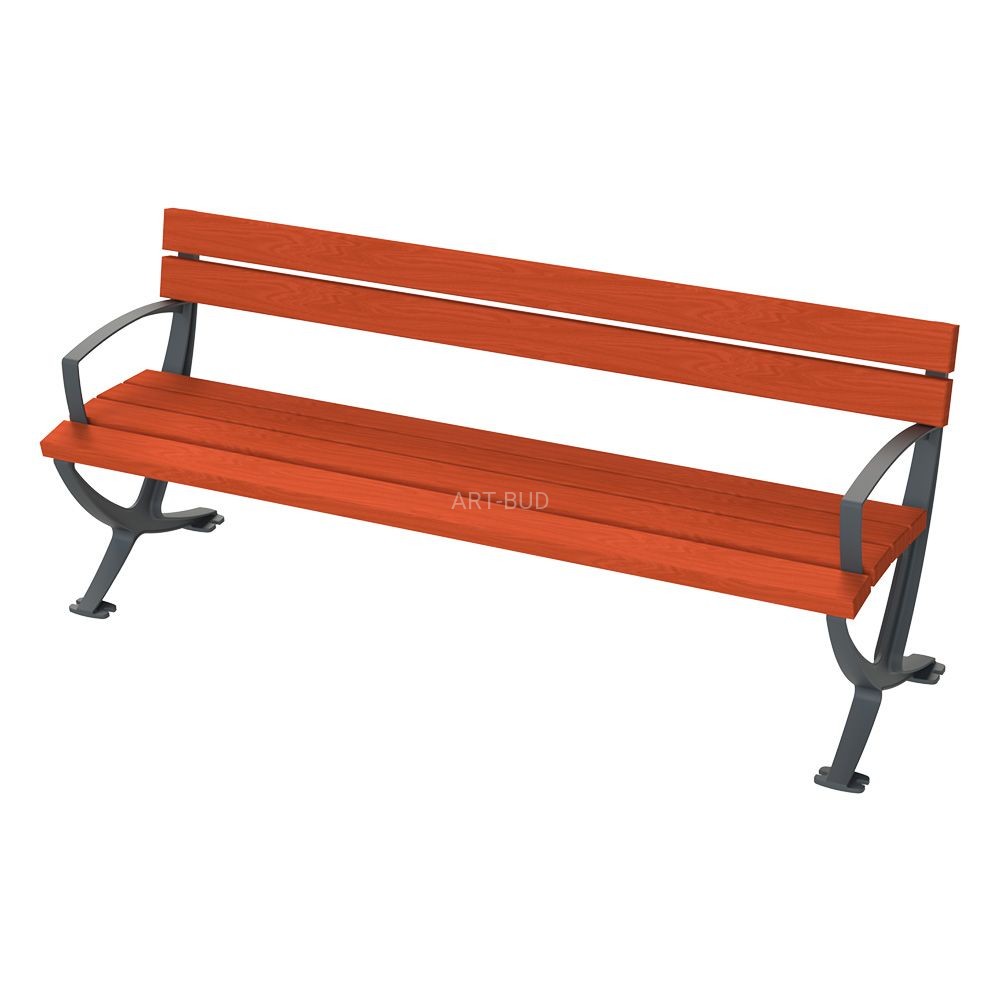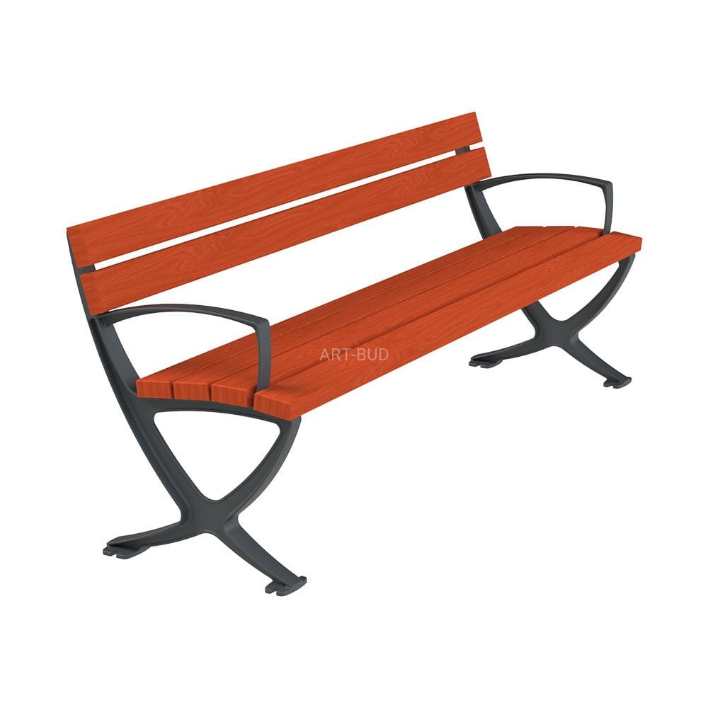 Nowoczesna ławka parkowa uliczna, drewniana, na konstrukcji żeliwnej, do samodzielnego montażu. Oferowana w trzech rodzajach drewna, długości 150 lub 180 cm. Do wyboru są również kolory lakierów i impregnatów, a także kolor farby nawierzchniowej konstrukcji żeliwnej. Ławka przygotowana do montażu przez przykręcenie w podłożu utwardzonym.