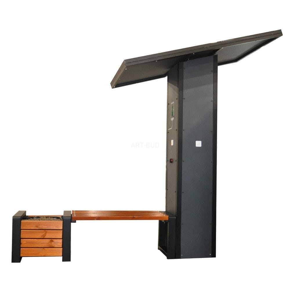 Panele fotowoltaiczne PV absorbują energię słoneczną, którą następnie zmieniają w prąd elektryczny przechowywany w banku energii. Każdy przechodzień może usiąść i podpiąć swoje urządzenie do portu USB i je swobodnie naładować.