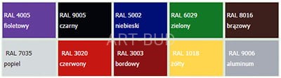 Ral 9005 czarny,Ral 5002 niebieski, Ral 6029 zielony, Ral 8016 brązowy, Ral 7035 popiel,