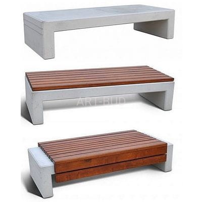 Uniwersalna ławka z betonu architektonicznego w trzech wersjach wykończenia. Betonowa, z siedziskiem drewnianym i drewnianym zabudowanym.