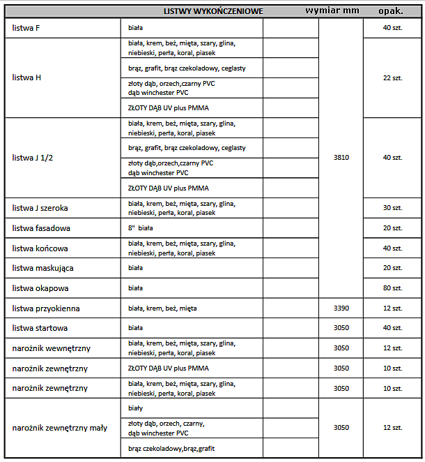 DOSTĘPNE RODZAJE I KOLORY LISTEW WYKOŃCZENIOWYCH: