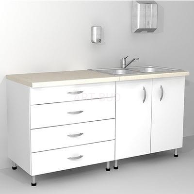 Jest to zestaw składający się z szafki z czterema szufladami i szafki ze zlewem 2-komorowym ze stali nierdzewnej i baterią.