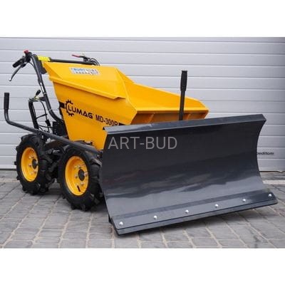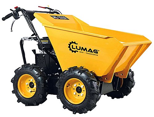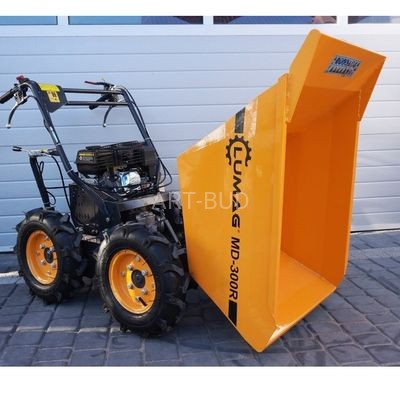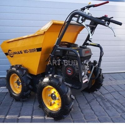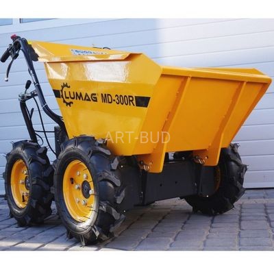 Miniwywrotki marki Lumag Germany sprawdzają się w najtrudniejszych warunkach dzięki wytrzymałej konstrukcji i wysokiej jakości materiałów. Taczka spalinowa wyposażona jest w czterosuwowy silnik o mocy 6,5 KM, oraz duże pompowane koła, które w połączeniu z napędem na wszystkie cztery koła, sprawia że maszyna sprawdza się w każdych nawet ciężkich warunkach. Budowa wywrotek pozwala na osiągnięcie dużej wydajności oraz sprawności. Miniwywrotkę MD-300R dzięki swym wymiarom może być swobodnie używana w budynkach i w wąskich przejściach, przejazdach takich jak standardowe futryny (szerokość maszyny to zaledwie 81 cm). Ładowność wynosi 300 kg objętość ładunkowa wynosi 125 L. Taczka spalinowa posiada 4 biegi, 3 do przodu i jeden wsteczny.