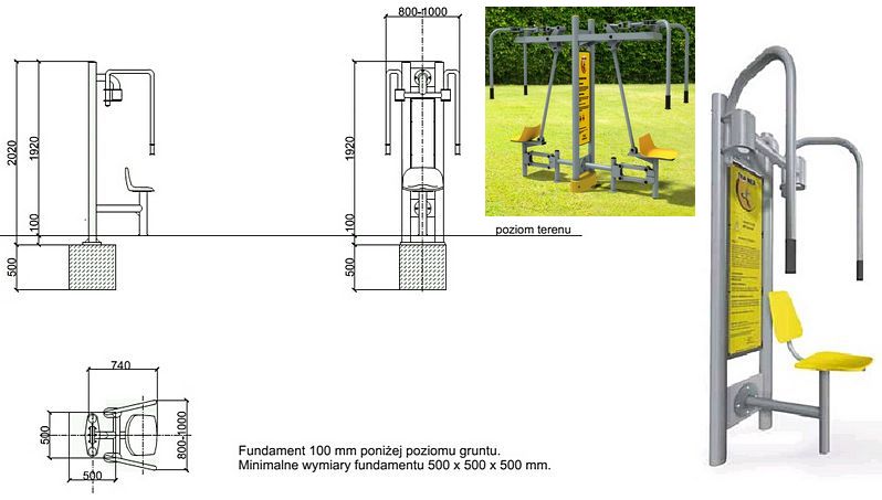 Montaż: mocowanie do fundamentów betonowych (wylewanych na miejscu), osadzonych 10 cm poniżej poziomu terenu. Daje to możliwość zastosowania pod urządzeniami różnego rodzaju nawierzchni: trawiastej, różnego typu nawierzchni bezpiecznej, z kostki brukowej itp.