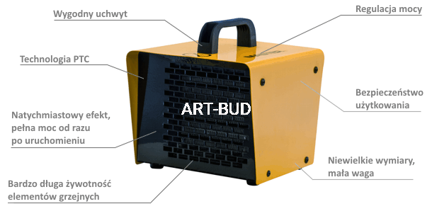 Nagrzewnice elektryczne tego typu są nie tylko wygodne w codziennej obsłudze, ale charakteryzują się także zastosowaniem licznych zabezpieczeń. Jednym z nich jest system, który chroni silnik przed przegrzaniem. Dla komfortu użytkownika, na trwałej obudowie znajduje się uchwyt, za pomocą którego można łatwo przenieść urządzenie w inne miejsce.