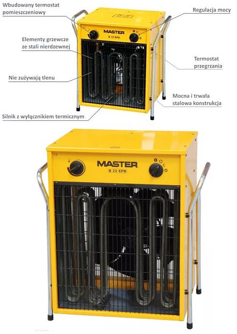 Nagrzewnica elektryczna o mocy regulowanej od 11-22 kW, to wysokowydajne urządzenie znajdujące szerokie zastosowanie. Zapewnia czyste, szybkie i bezpieczne ogrzewanie. Doskonale nadaje się do ogrzewania awaryjnego, jest łatwa w obsłudze i w pełni przenośna. Nagrzewnice elektryczne sprawdzają się w prawie każdych warunkach. Szybka instalacja i duża wydajność urządzeń sprawiają, że ciepło w pomieszczeniu jest odczuwalne natychmiast po uruchomieniu. Nagrzewnice elektryczne Master są w pełni przenośne i mogą być stosowane zarówno w pomieszczeniach biurowych, mieszkalnych, jak i w dużych obiektach przemysłowych. Nagrzewnice elektryczne firmy Master wykonane są z najwyższej klasy komponentów z odpowiednimi certyfikatami, zapewniając tym samym wysoką wydajność i niezawodność. Nagrzewnica B22 EPB znajduje zastosowanie : zamknięta przestrzeń rolnictwo, budownictwo, garaże, sklepy, domy, biura, piwnice, magazyny polecane dla malarzy, hydraulików, tynkarzy, płytkarzy itp.