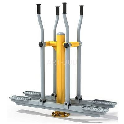 Narciarz podwójny, urządzenie siłowni zewnętrznej z serii Eco: trening ogólnorozwojowy calego ciała, ćwiczenia wzmacniają mięśnie nóg, ramion i tułowia, poprawiają koordynację ruchową, korzystnie wpływają na układ krążeniowo-oddechowy.