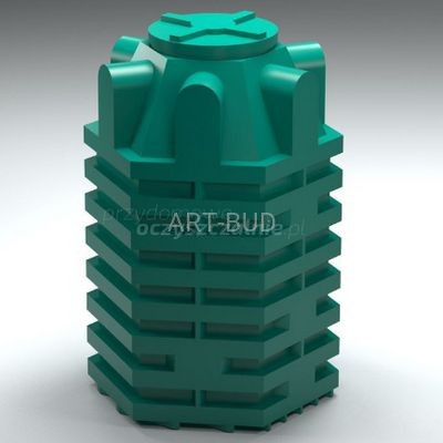 Zbiornik prefabrykowany - Monolityczny zbiornik polietylenowy wyposażony w króćce i uszczelki ułatwiające montaż rur oraz właz rewizyjny z pokrywą i kosz filtrujący