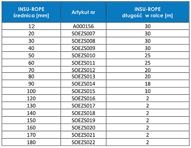 - Dobrać średnicę INSU-ROPE dla danej szczeliny dylatacyjnej wg tabeli dostępności.