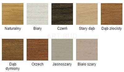 Naturalny i 8 odcieni : biały, czerń, stary dąb, dąb złocisty, dąb dymiony, orzech, jasnoszary, biało szary