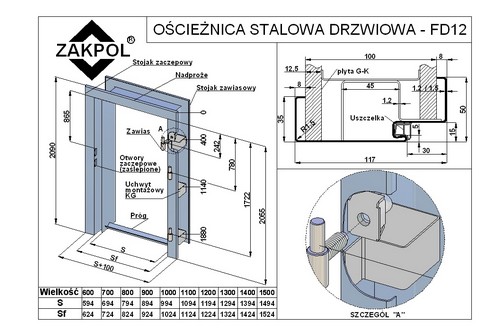 Ościeżnica stalowa FD12 z uszczelką do zabudowy G-K na profil 75mm uniwersalna ZAKPOL (1szt)