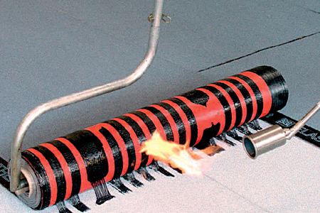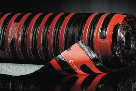 syntetyczna czerwona folia syntanowa oraz wzdłużne, profilowane pasma klejowe tworzące system kanałów wentylacyjnych, zabezpieczone folią antyadhezyjną (pow. dolna)