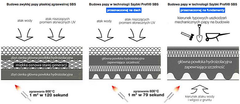 Zachowanie wszystkich deklarowanych parametrów technicznych oraz właściwości użytkowych bitumów i kauczuków SBS po zamocowaniu papy w miejscu przeznaczenia (dach lub fundament) – poprzez skrócony o Co najmniej 30% czas zgrzewania papy do podłoża