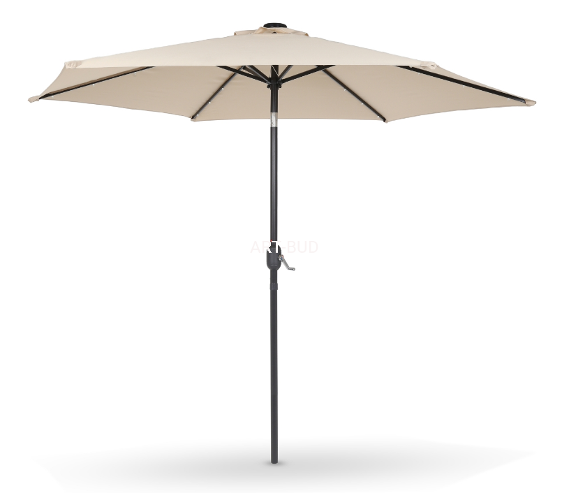 Wysokiej jakości uniwersalny parasol ogrodowy dedykowany do stołów ogrodowych z centralnym otworem, do mocowania w uchwytach betonowych lub z tworzyw sztucznych wypełnionych wodą, ewentualnie do wbicia w miękki grunt. Podświetlenie ledowe czaszy od wewnątrz, załączane przyciskiem przy korbce. Bardzo solidna konstrukcja parasola wykonana ze stali pomalowanej farbą proszkową. Czasza parasola została wykonana z wytrzymałego materiału poliestrowego. Dzięki zastosowaniu systemu z korbą składanie i rozkładanie parasola jest niezwykle łatwe i komfortowe. Ogromne wymiary parasola zapewniają dużą ilość cienia, dlatego parasol idealnie sprawdzi się w przydomowych ogródkach i na działkach, jak również w ogródkach kawiarni czy też restauracji.