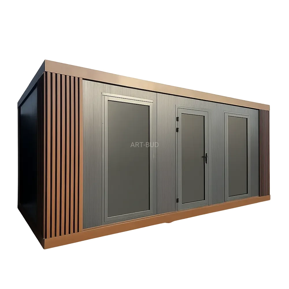 Pawilon z dużymi przeszkleniami, przeznaczony na punkt handlowy, biuro lub ekspozycję.