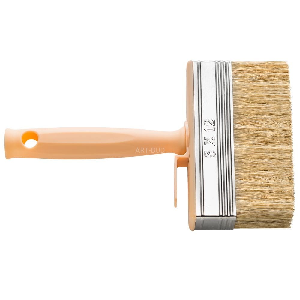 Pędzel tworzy mieszanka włosia naturalnego i syntetycznego. Dobrze współpracuje ona z większością farb dostępnych obecnie na rynku. Rękojeść z tworzywa sztucznego z otworem do zawieszania i zawieszką do mocowania na naczyniu.
