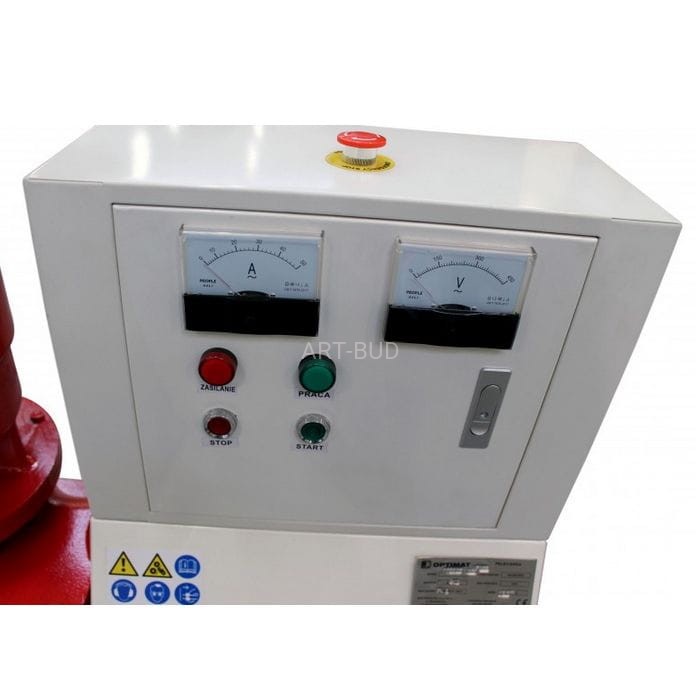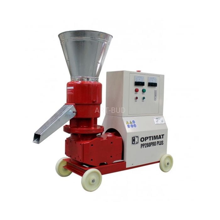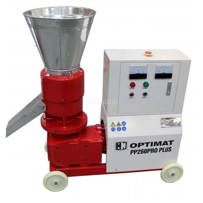Przemysłowa peleciarka Polskiej marki Optimat model PP260PRO do dużych ilości granulatu w krótkim czasie, świetnie spisuje się do produkcji pelletu z materiałów organicznych, które można wykorzystać do ogrzewania i nawożenia oraz jako pasze do karmienia zwierząt.