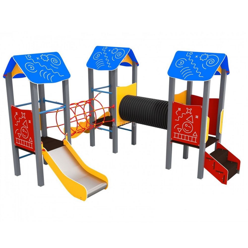 Zestaw na plac zabaw 3-wieżowy ze zjeżdżalniami i 2 tunelami. Zabawka dedykowana dzieciom najmłodszym w wieku 1-4 lat. Wieże ustawione są w sposób, tworzący literę L. Zestaw w żywych kolorach, z zamieszczonymi rysunkami na ściankach bocznych oraz daszkach, zachęcającymi dzieci do zabawy. Konstrukcja wykonana jest ze stali czarnej, zabezpieczonej przed korozją, odpornej na warunki atmosferyczne i intensywne użytkowanie. Podesty wykonane są z płyty HPL z fakturą antypoślizgową, odpornej na warunki atmosferyczne oraz zapewniającej bezpieczeństwo użytkowania.