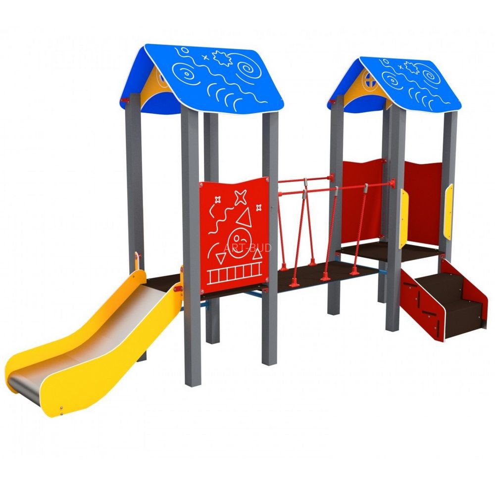 Zestaw na plac zabaw 2-wieżowy ze zjeżdżalnią i mostkiem. Zabawka dedykowana dzieciom najmłodszym w wieku 1-4 lat. Zestaw w żywych kolorach, z zamieszczonymi rysunkami na ściankach bocznych oraz daszkach, zachęcającymi dzieci do zabawy. Konstrukcja wykonana jest ze stali czarnej, zabezpieczonej przed korozją, odpornej na warunki atmosferyczne i intensywne użytkowanie. Podesty wykonane są z płyty HPL z fakturą antypoślizgową, odpornej na warunki atmosferyczne oraz zapewniającej bezpieczeństwo użytkowania.
