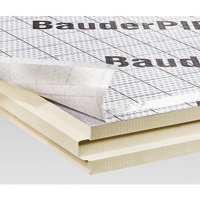BauderPIR SF płyta obustronnie laminowana aluminium dodatkowo na górnej powierzchni dodatkowo dyfuzyjna specjalna papa przeciwodblaskowa.