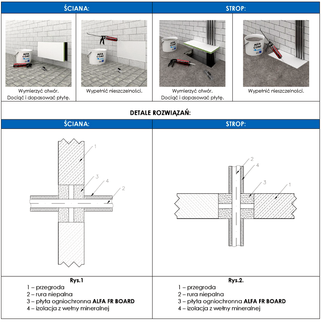 Płyta ALFA FR BOARD i farba ALFA COAT przeznaczona jest do uszczelniania przejść instalacyjnych: