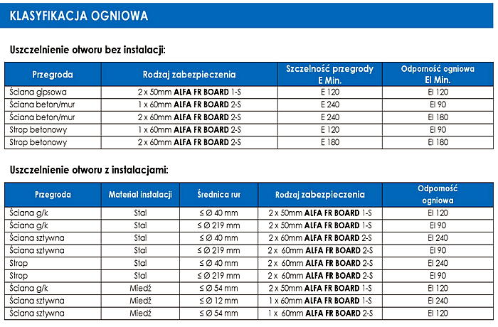 Płyta przeciwogniowa ALFA FR BOARD to płyta, z wełny mineralnej o gęstości 160 kg/m3, pokryta jednostronnie lub obustronnie, akrylową farbą pęczniejącą ALFA COAT. Zastosowanie rodzaju płyty zależy od wymaganej odporności ogniowej oraz rodzaju przegrody. Zestaw (płyta+farba) przeznaczony jest do ogniochronnego uszczelniania, w ścianach i stropach, przejść rur stalowych i miedzianych oraz przejść kombinowanych z rurami z tworzyw sztucznych, kablami i kanałami wentylacyjnymi. W normalnych temperaturach płyta i powłoka pozostają elastycznew stopniu umożliwiającym termiczne i mechaniczne ruchy instalacji w otworach. Oba produkty nie ulegają szkodliwym działaniom oleju, grzybów, wilgoci, szkodników ani warunków atmosferycznych. Nie zawierają chlorowca i azbestu. Dopuszcza się stosowanie farby ALFA COAT na niepomalowanych płytach z wełny mineralnej o odpowiedniej grubości i gęstości.