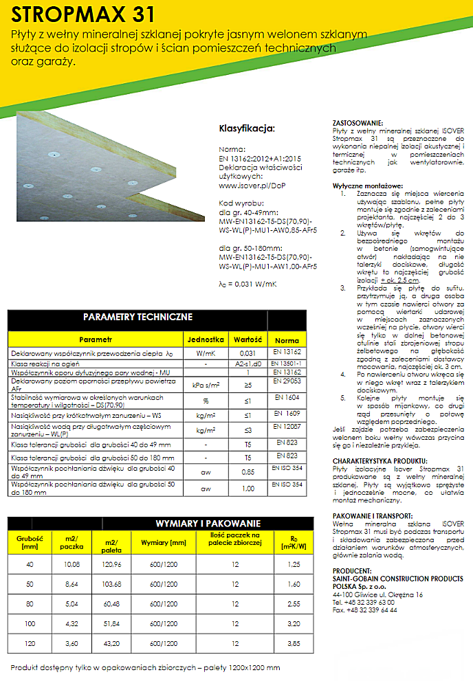 STROPMAX 31, to płyta z wełny szklanej zaprojektowana specjalnie do suchej izolacji cieplno-akustycznej garaży, pomieszczeń technicznych i technologicznych. Płyty są bardzo lekkie, spreżyste, proste i szybkie w montażu, zabezpieczone przed obsypywaniem i posiadają niezwykle parametry izolacyjności termicznej i akustycznej.
