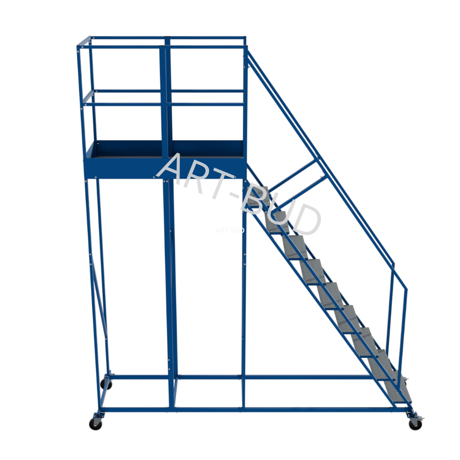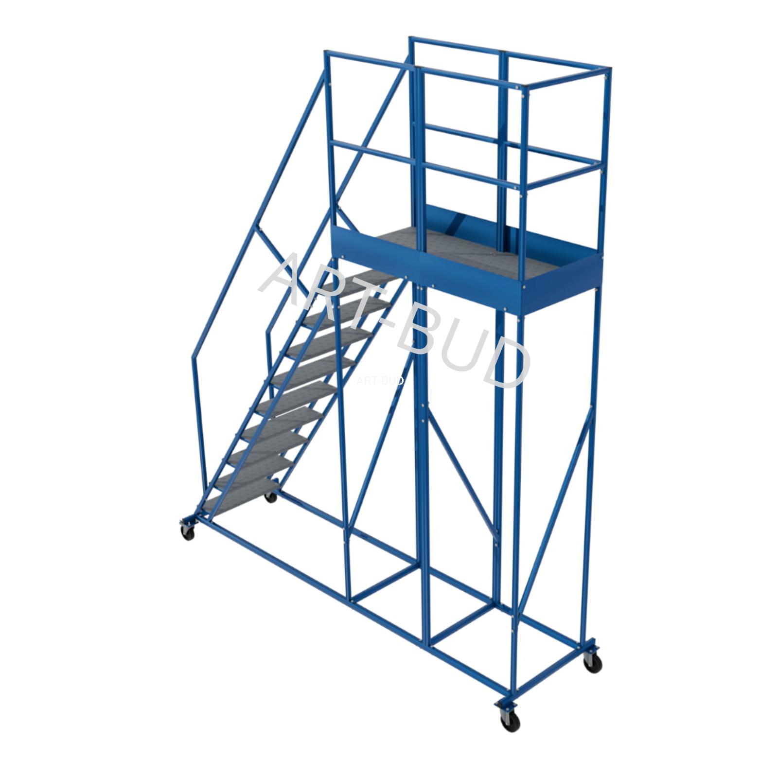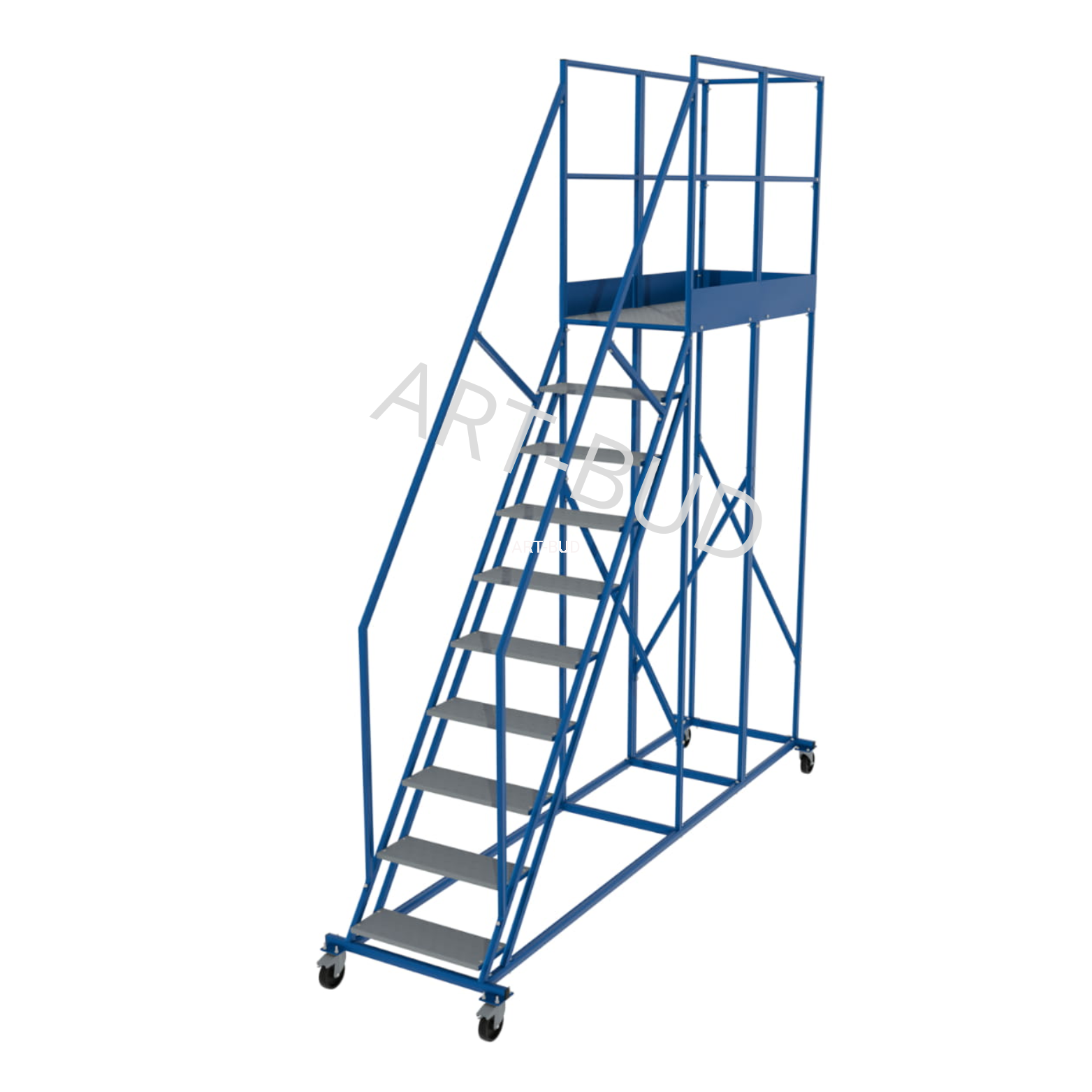Dzięki lakierowaniu proszkowemu konstrukcji oraz cynkowaniu ogniowemu stopni, podest jezdny może być używany na zewnątrz bez obaw o korozje i ścieranie.