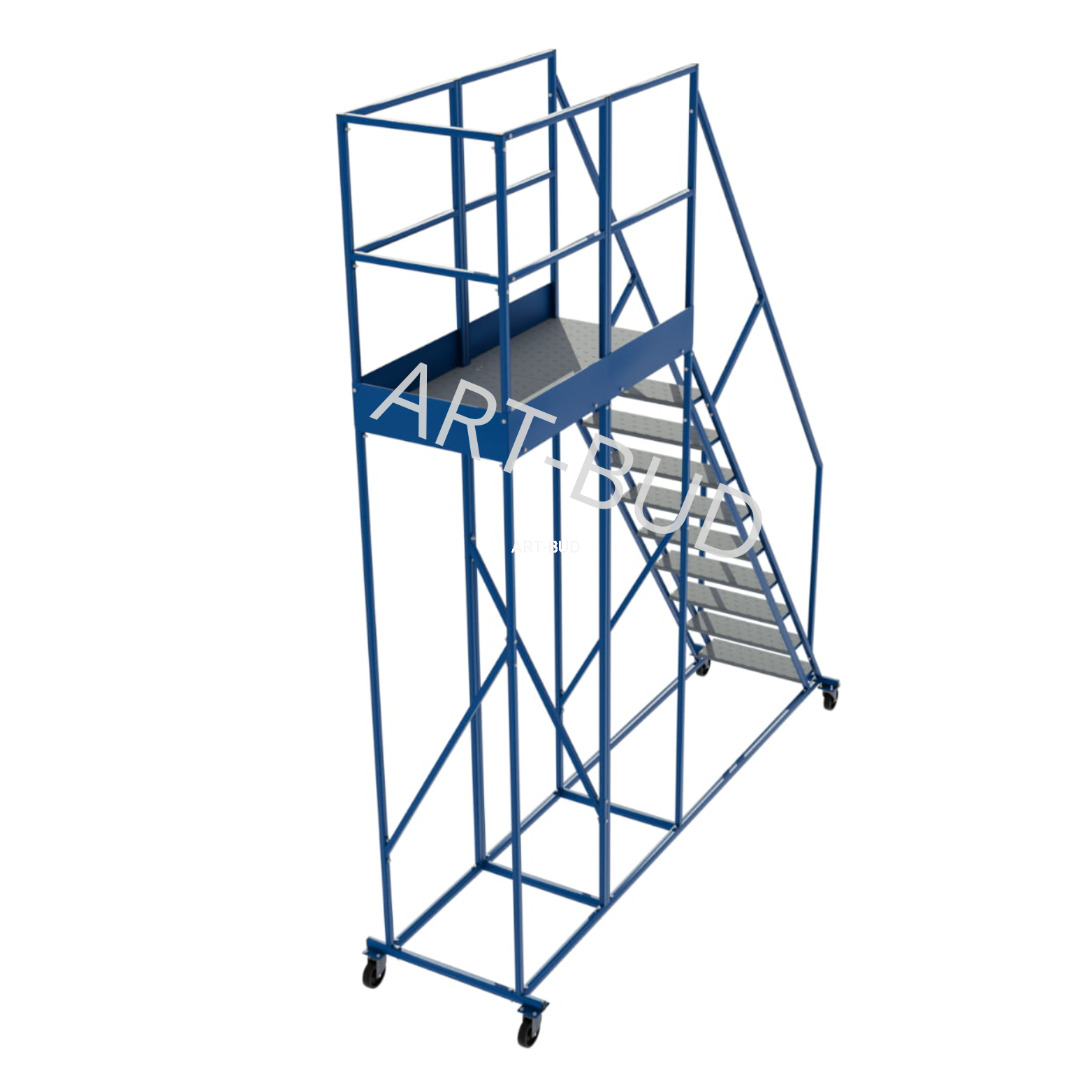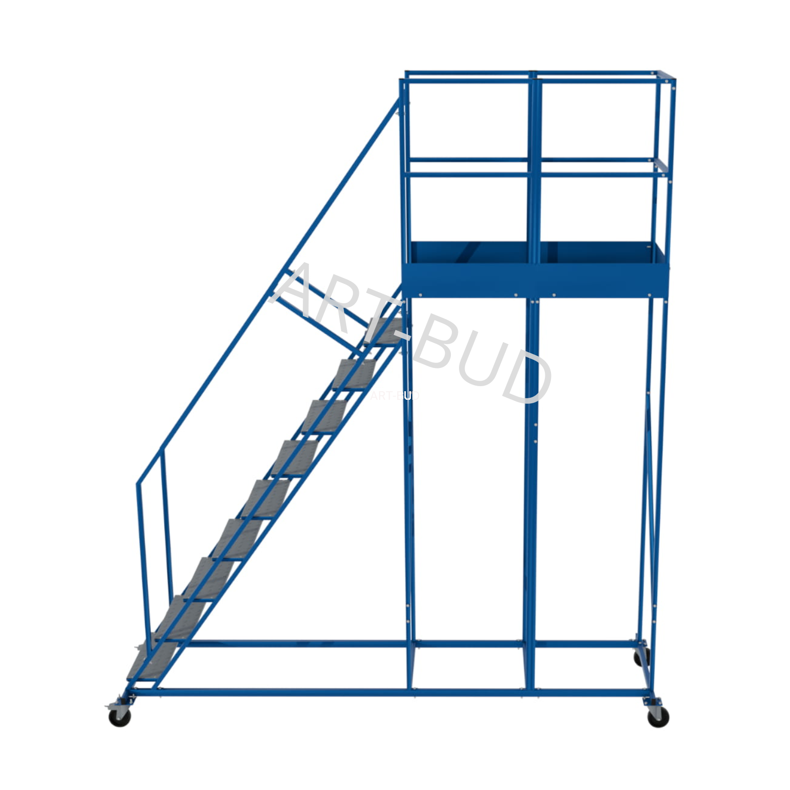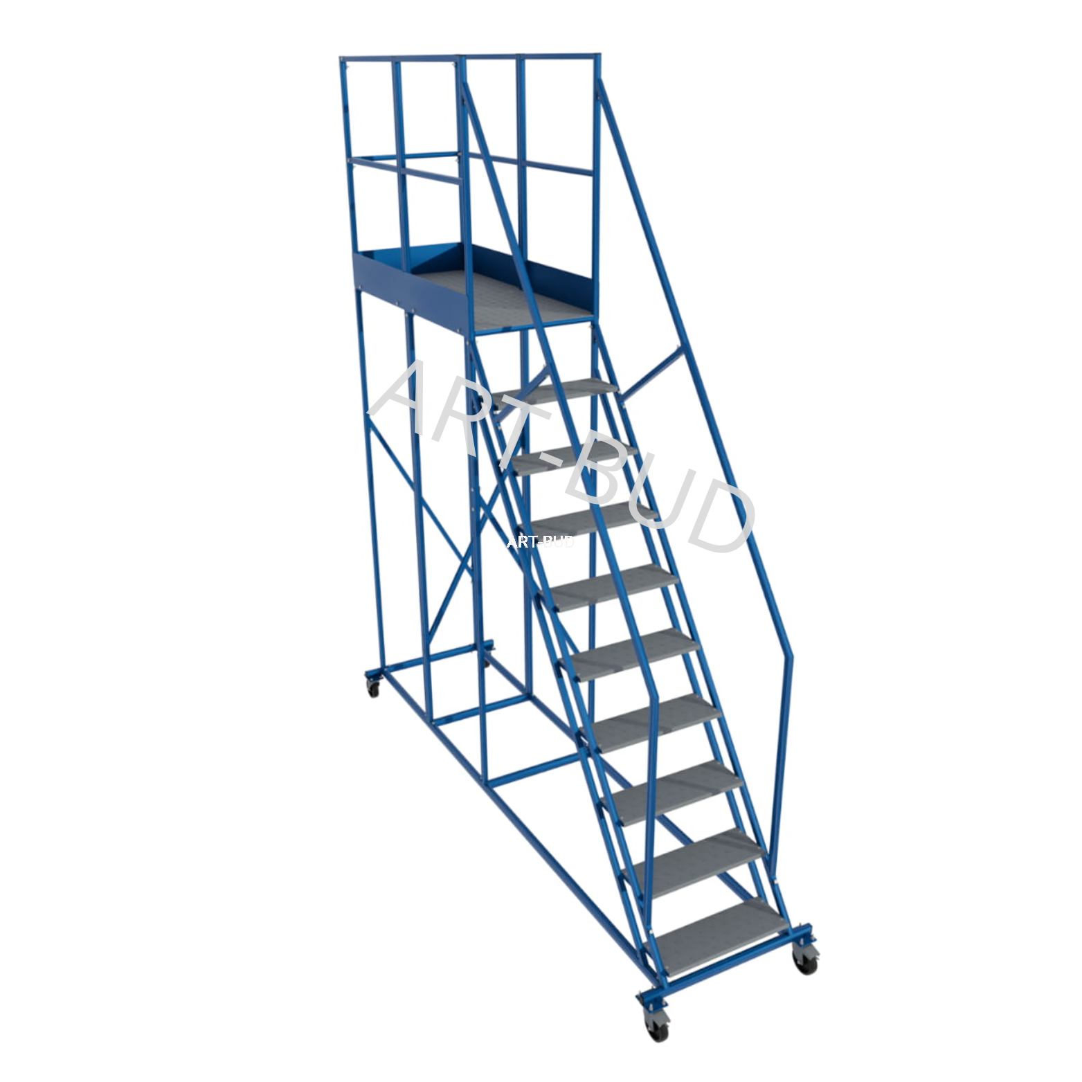 Dzięki lakierowaniu proszkowemu konstrukcji oraz cynkowaniu ogniowemu stopni, podest jezdny może być używany na zewnątrz bez obaw o korozje i ścieranie.