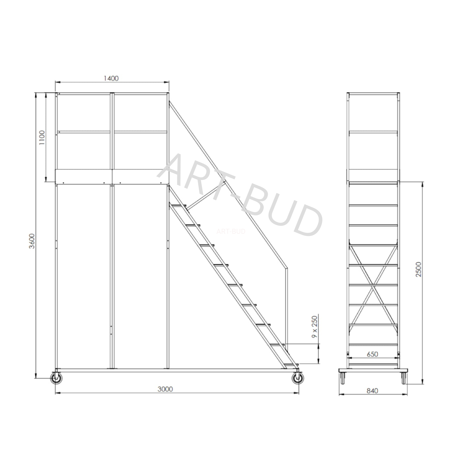 Podest jezdny, platforma jezdna 9+1, 2,5m LONG 1400mm