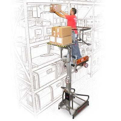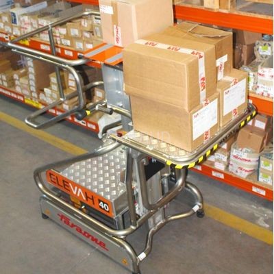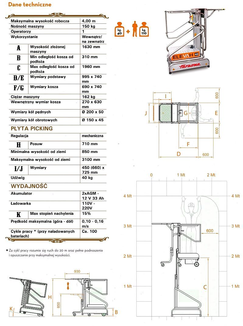 ELEVAH 40B Picking to w pełni zautomatyzowana platforma typu picking do pracy na wysokości do 4 m i automatycznym podnoszeniem, zasilana akumulatorem 24 V. Wykonana w całości z aluminium, jest niezwykle poręczna i kompaktowa. Duża płaszczyzna załadowcza jest regulowana na wysokości przez operatora znajdującego się w koszu, przy użyciu pilota. Podnośniki towarowe Elevah to bardzo praktyczne urządzenia, które są lekkie i dzięki temu są wszechstornne i łatwe w użytkowaniu. Wyposażone są w wysokiej jakości kółka i uchwyty, ułatwiające przemieszczanie się podnośnika. Po złożeniu urządzenie staje sie kompaktowe i zajmuje małą przestrzeń magazynową oraz transportową. Mimo że wykonane są z aluminiowych profili 9dzięki czemu są lekkie) są bardzo wytrzymałe i bezpieczne. Regulacja pola załadowczego możliwa jest dzięki specjalnie zaprojektowanemu pilotowi, który znajduje się w platformie tuz obok operatora.