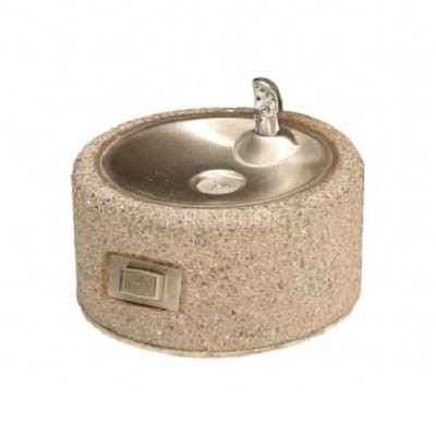 Wolnostojące poidełko dla zwierząt, wibrobetonowe. Okrągła misa została wykonana ze stali nierdzewnej z wylewką wandalooodporną.
