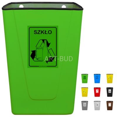 Efektowny pojemnik 50 litrowy do segregacji odpadów w miejscach zadaszonych. Pojemniki barwione trwałymi żelkotami w jaskrawych efektownych kolorach, ułatwiają segregację i zachęcają do zachowania czystości. Pojemnik przystosowany do przymocowania tylną ścianką do muru lub innego trwałego oparcia. Oferowany w 9 kolorach wg wzornika.
